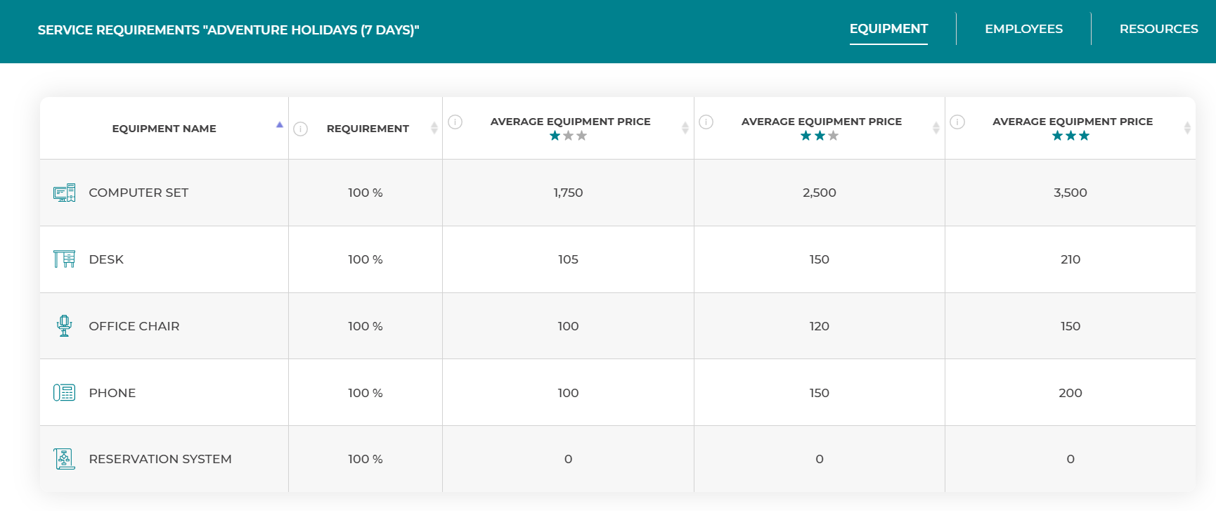 Equipment. You will need 5 pieces of equipment to prepare adventure holidays. This is the equipment needed by your employee who will perform that service. There is a desk, office chair, reservation system, a telephone and a computer set. Each piece of the equipment is offered by manufacturers on three levels of quality - basic (☆), standard (☆☆) and premium (☆☆☆). The higher the quality, the higher the price of the equipment, but your employees will be more satisfied working on high quality, i.e. more ergonomic and reliable equipment. Each piece of equipment may, in addition to the purchase costs, also generate maintenance costs, e.g. in the case of reservation system, the initial price is 0 EUR, however, you will have to pay a monthly subscription. Information on the costs of equipment maintenance can be found in the Equipment tab (after clicking 'Buy Equipment' button).