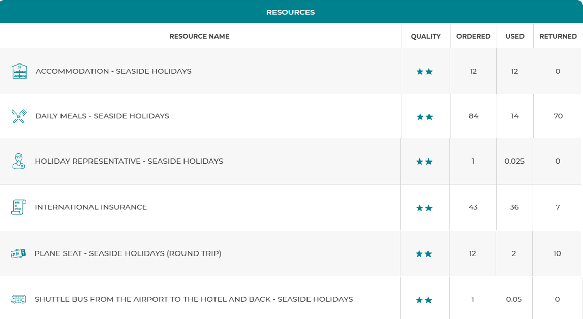 Resources. To organize the Adventure holidays, you will need only 6 resources, i.e. accommodation, daily meals, holiday representative, insurance, plane seats, and a shuttle bus. The table shows average prices of the required resources depending on the quality. Remember that the exact prices can be found in the Suppliers tab.