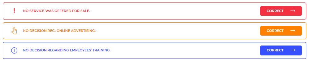To check or correct the decisions indicated in the warnings on the error list, use the 'Correct' button on the right side of the message or go to the appropriate tab in the top menu. |